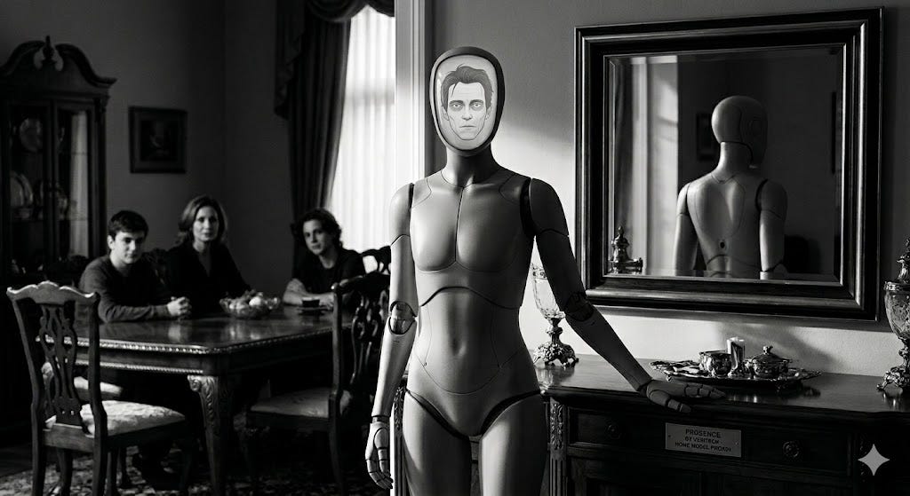 The Proxy was humanoid enough to be familiar: two arms, two legs, a head that sat at the right height when it met your eyes. But synthetic enough to stay just clear of the uncanny valley. Its face was a smooth screen that displayed a simplified version of whoever was controlling it, features rendered in clean digital lines. Its movements were fluid, responsive, almost natural. Almost. It is manufactured by Veritech Prosence, a division entirely separate from the pharmaceuticals arm, a point the company’s PR team was at pains to make clear in every press release, and which no one in the Ashford household had ever thought about once.